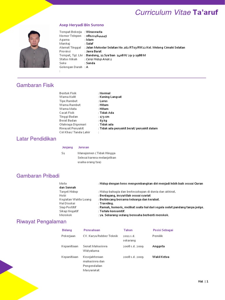 Download Cv Taaruf 2020 Docx Curriculum Vitae Ta U2019aruf M Afief Assyafiq Tempat Bekerja Smp Qur U2019an Darul Fattah Nomor Telepon 0857 8853 2073 Agama Course Hero from www.coursehero.com Smp qur'an darul fattah nomor telepon : Ikhlasul amal salahuddin nama panggilan : Contoh cv taaruf asli saya alhamdulillah sudah menikah. Resume.io has been visited by 100k+ users in the past month Create a professional cv in just 15 minutes, easy Tempat & tanggal lahir : Festival madinah nomor telepon : Btw ada beberapa hal yang mesti kamu tau dulu ya contoh cv taaruf ini menyesuaikan dengan cv taaruf saya yang asli namun saya edit di beberapa tempat.